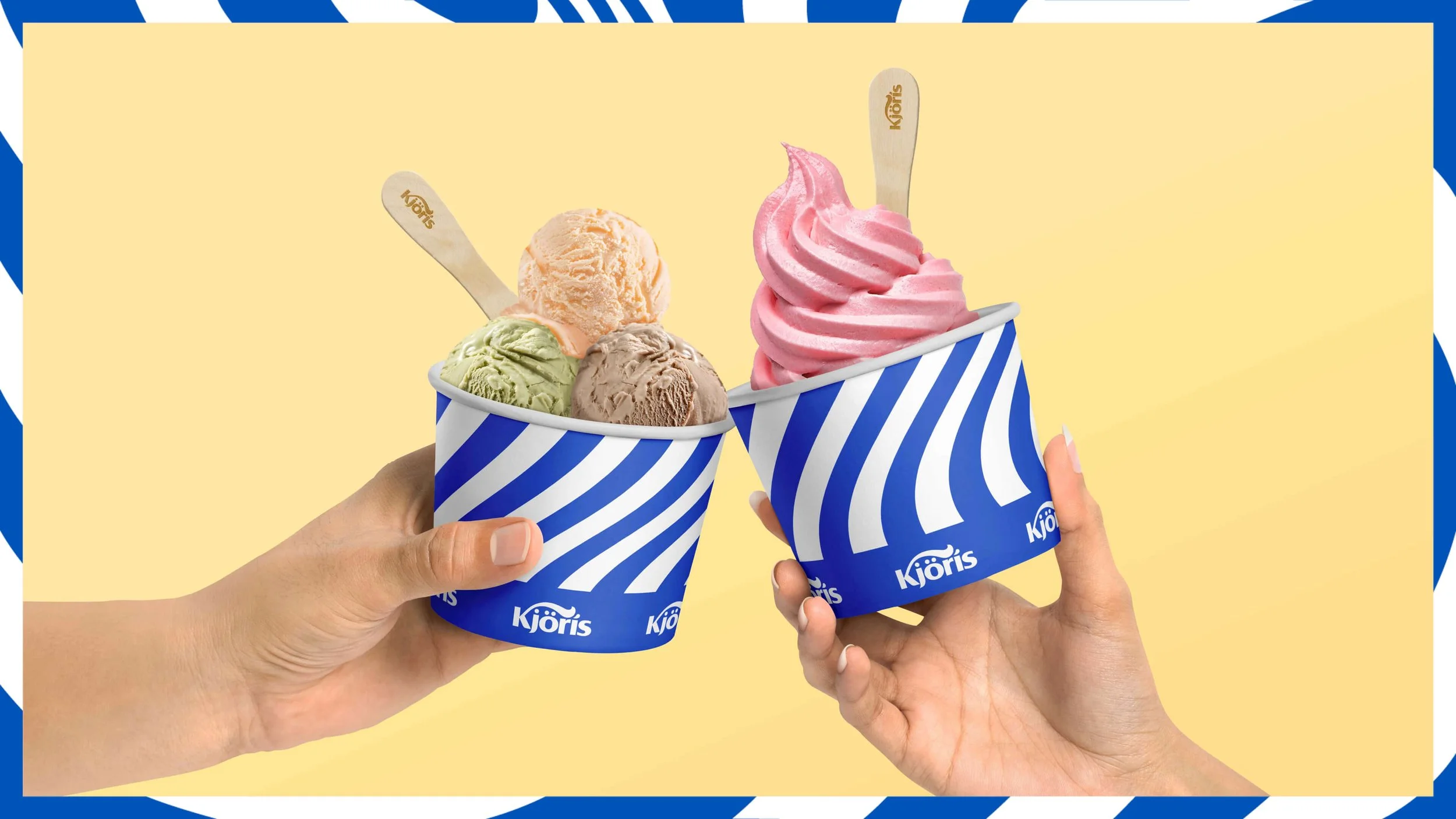 The pattern is inspired by the lines that are produces when pumped out of the machines and also by the swoosh in the logo’s K. Stripes have been an iconic element for ice cream parlours but we used them with a twist.